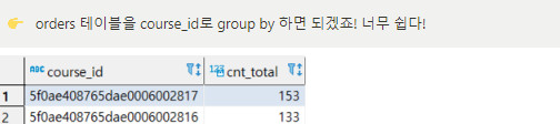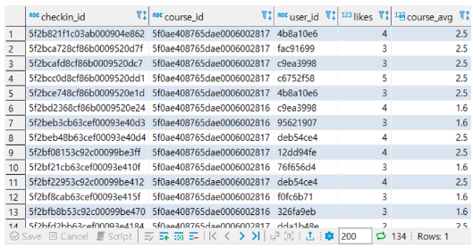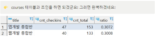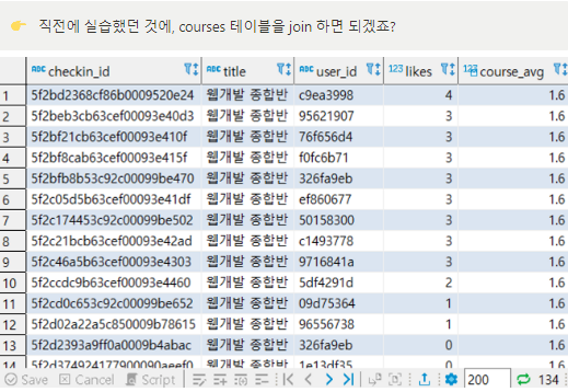 2.checkins 테이블에 과목명별 평균 likes수 필드 우측에 붙여보기