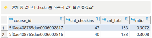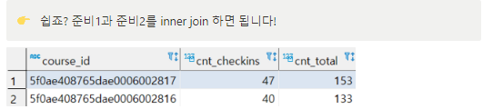 select a.course_id, b.cnt_checkins, a.cnt_total from