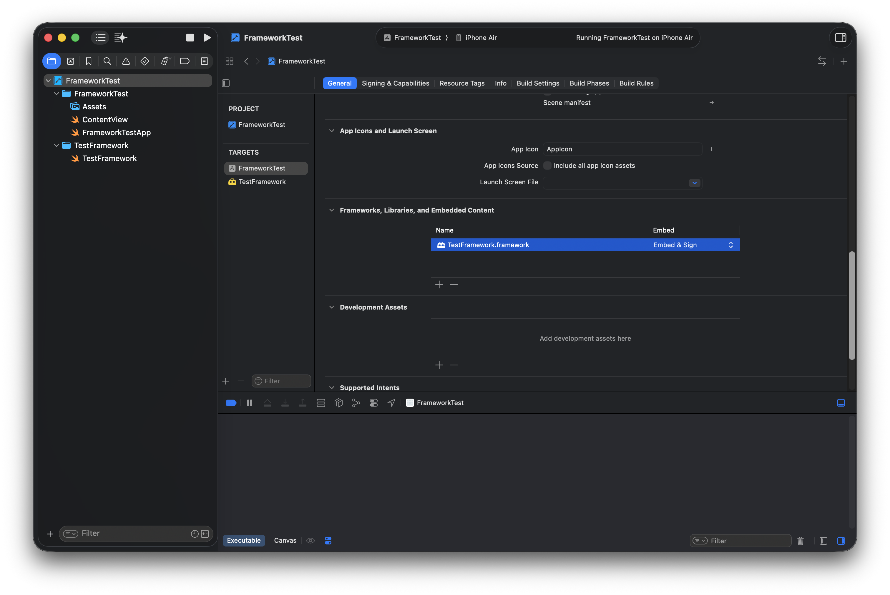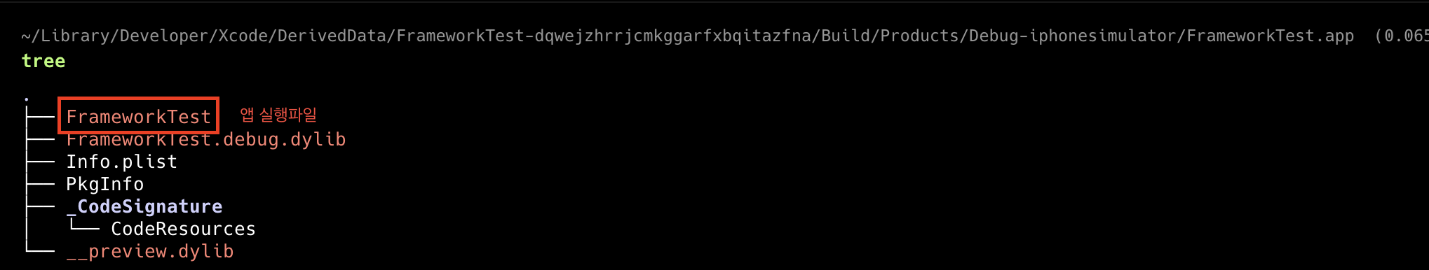 참고로 Runpath Search Paths에서 설정한 대로, 앱 번들 내부에 Frameworks라는 디렉토리가 존재 했으며, 해당 디렉토리 내부에 TestFramework라는 프레임워크 실행 파일이 포함되어 있었다. 이를 통해 해당 프레임워크는 빌드 시 실행 파일에 병합되지 않고, 런타임에 동적으로 로드되어 참조되는 구조임을 확인할 수 있었다.