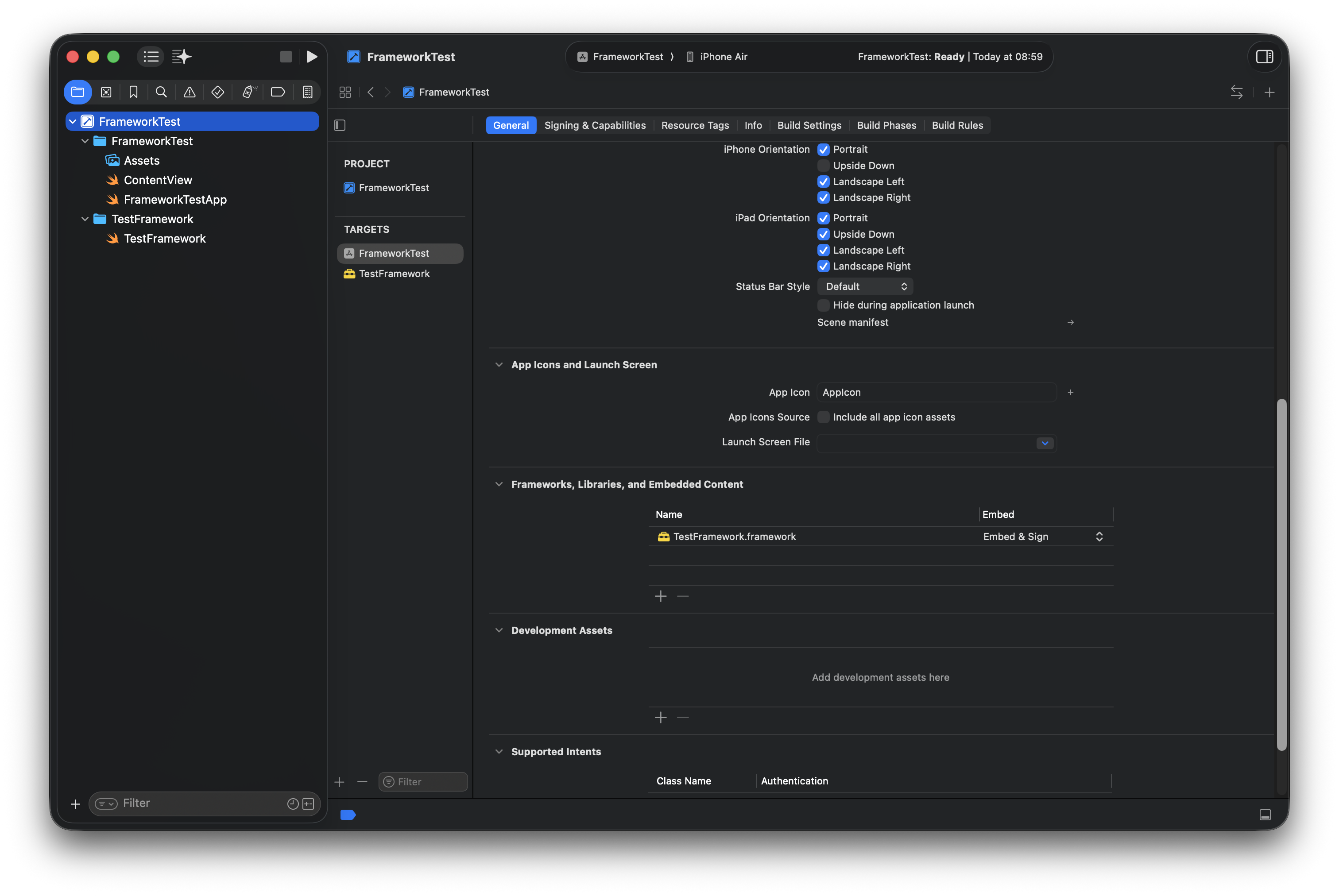 위의 과정까지 마치면, 왼쪽 탭에서 프레임워크 파일이 추가되고, 호스트 앱의 Frameworks 설정에 추가한 프레임워크가 잘 등록된 것을 확인할 수 있었다.