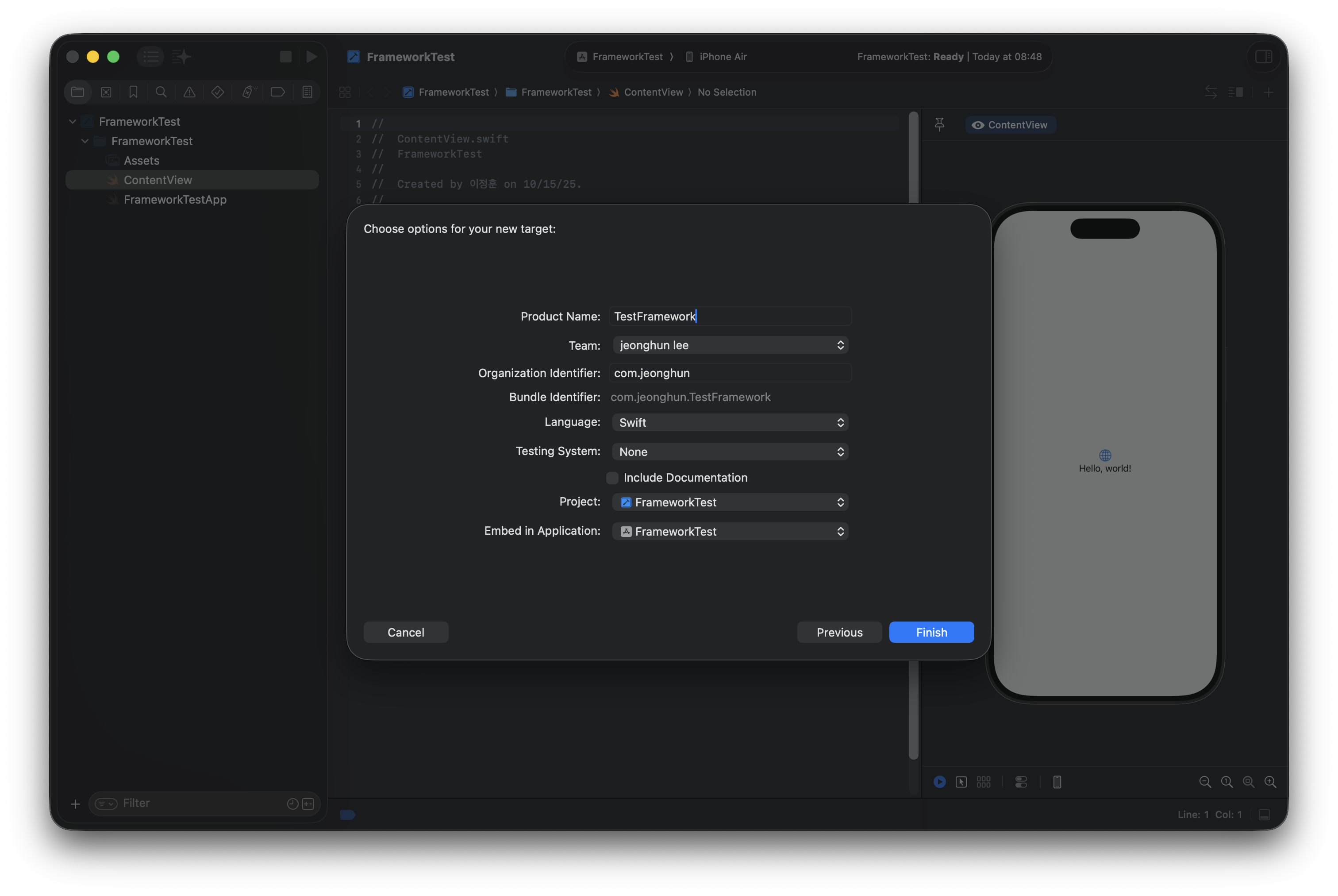 이때, Project 항목에도 호스트 앱을 지정하여 타깃을 설정하고, Embed in Application 옵션에도 호스트 앱을 설정하여 호스트 앱 번들 안에 프레임워크가 포함되도록 한다.