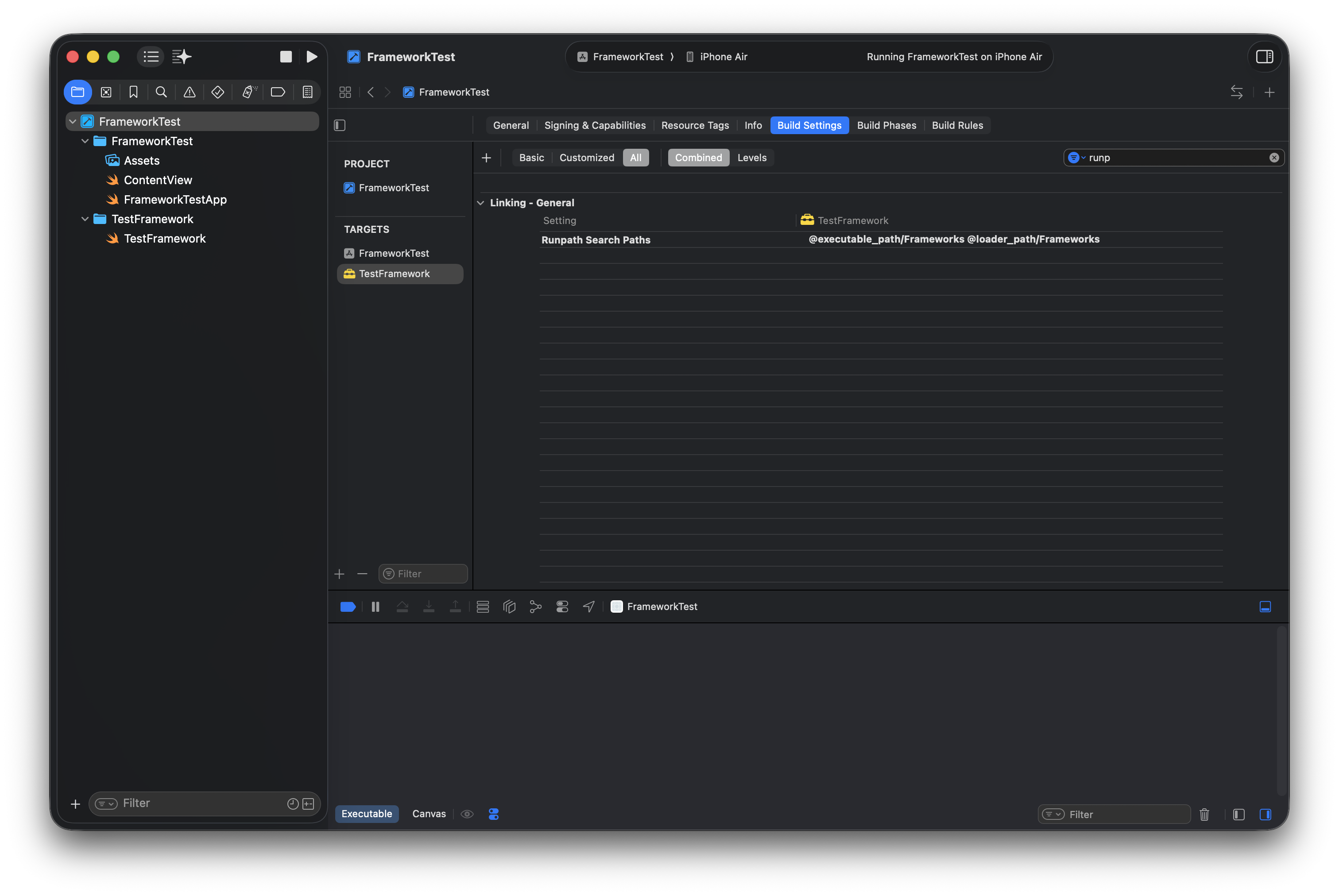 이때, 런타임에서 참조할 프레임워크의 경로는 @executable_path(메인 앱) 디렉토리 아래 Frameworks 디렉토리를 참고하게 된다. 해당 경로는 Xcode의 Build Settings의 Runpath Search Paths를 통해서 설정할 수 있었다.