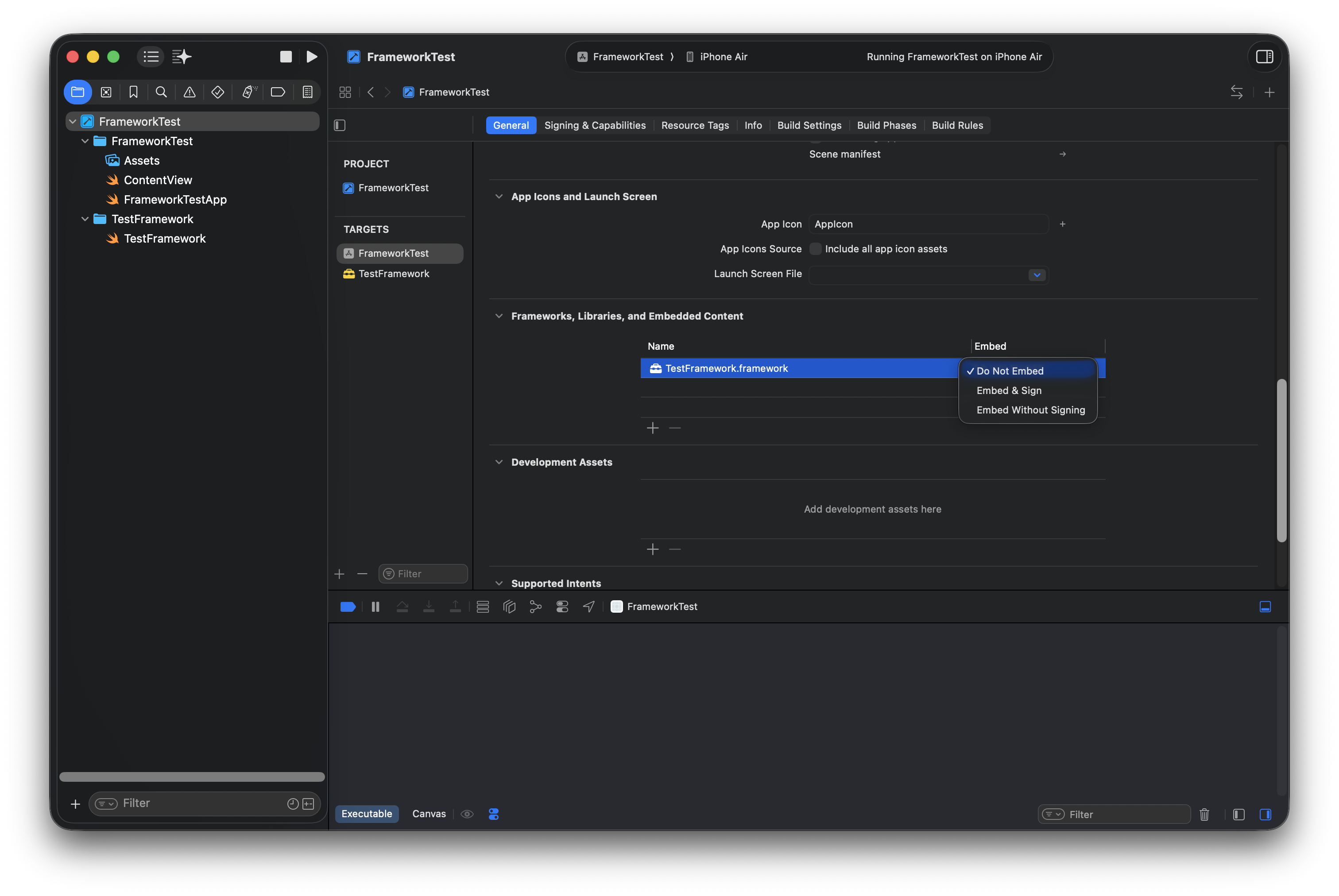 Static Library는 이미 메인 앱 내부에 포함되어 있기 때문에, 앱 번들 내 Frameworks 디렉터리에 동일한 프레임워크 파일이 존재할 경우, 이는 중복된 코드가 포함된 구조로 에러를 발생시킬 수 있다. 이를 해결하기 위해서는 메인 앱 타깃의 Frameworks, Libraries, and Embedded Content 설정에서 해당 프레임워크의 Embed 옵션을 Do Not Embed로 지정해야 한다. 이렇게 하면 정적으로 링크된 Static Library가 앱 번들 내 Frameworks 디렉토리에 중복으로 포함되는 것을 방지할 수 있다.