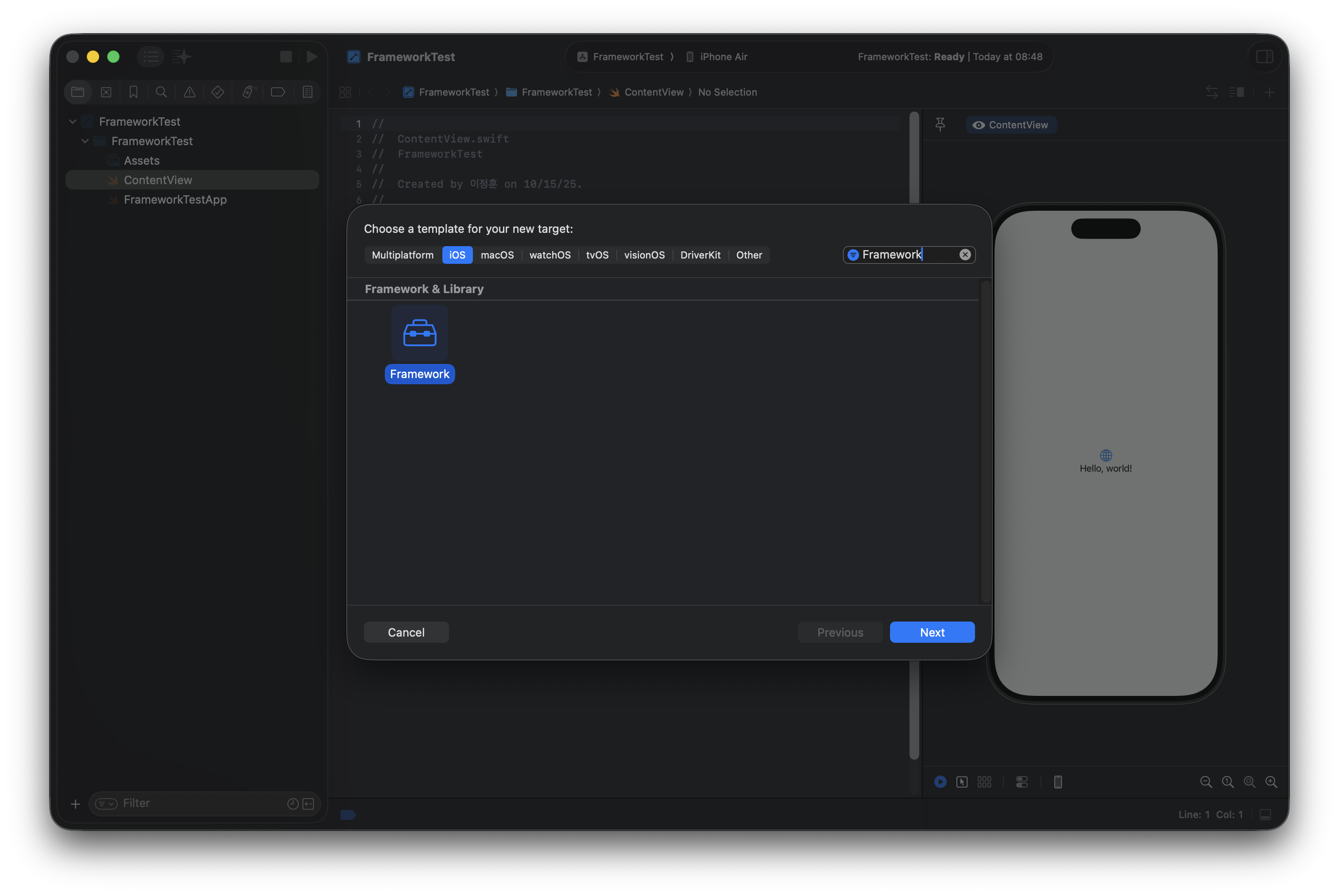 File > New > Target > Framework를 선택한다.