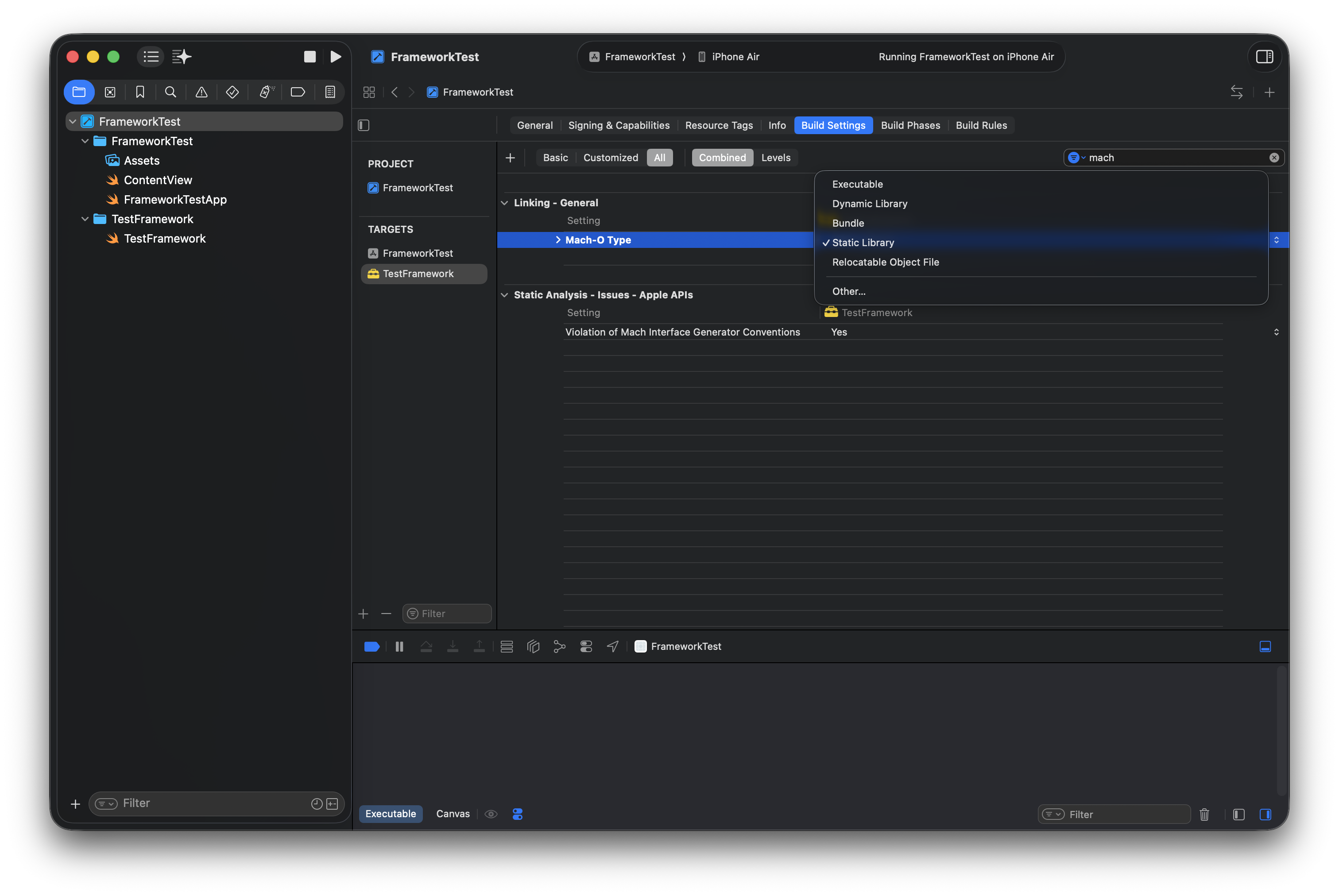 Static Library는 빌드 시 메인 앱과 정적으로 링크되는 형태를 의미한다. 즉, FrameworkTest 앱을 빌드할 때, TestFramework의 코드가 실행 파일에 직접 포함되어 최종적으로 하나의 Executable로 생성된다. 따라서 Static Library는 앱 크기의 증가와 빌드 시간이 증가할 수 있지만, 런타임 시간을 단축할 수 있다.