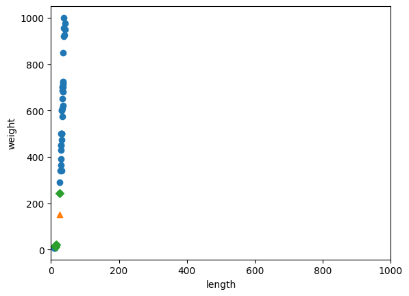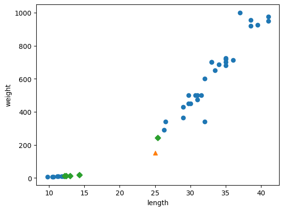 # 산점도를 보았을때 도미가 가까워 보이지만 K값으로 안 뽑힌 것은 length와 weight의 범위가 다르기 때문이다.
