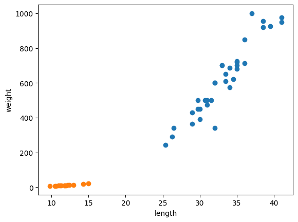 # 생선을 분류하기 위해 두 가지 생선의 데이터를 준비한다.