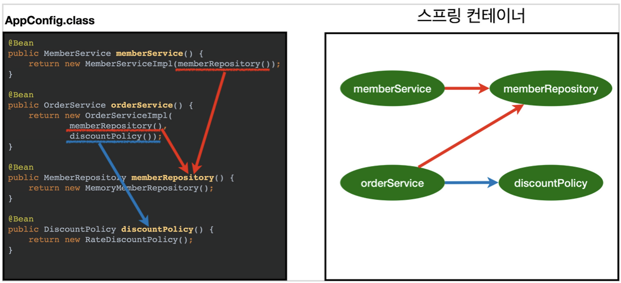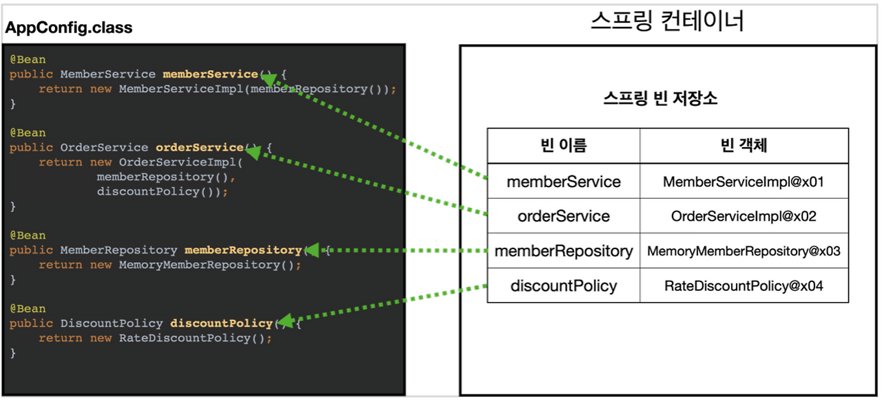 여기서 스프링 컨테이너는 @Configuration이 붙은 AppConfig를 설정 정보로 사용하고, @Bean이라고 붙은 메서드를 모두 호출해서 반환된 객체를 스프링 컨테이너에 등록한다.