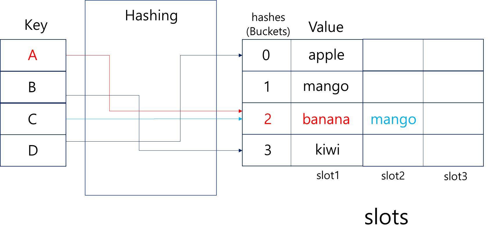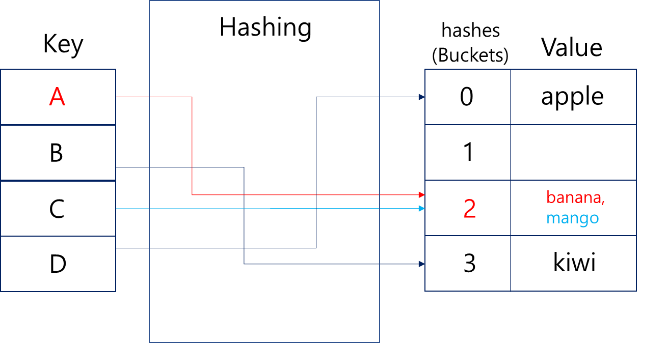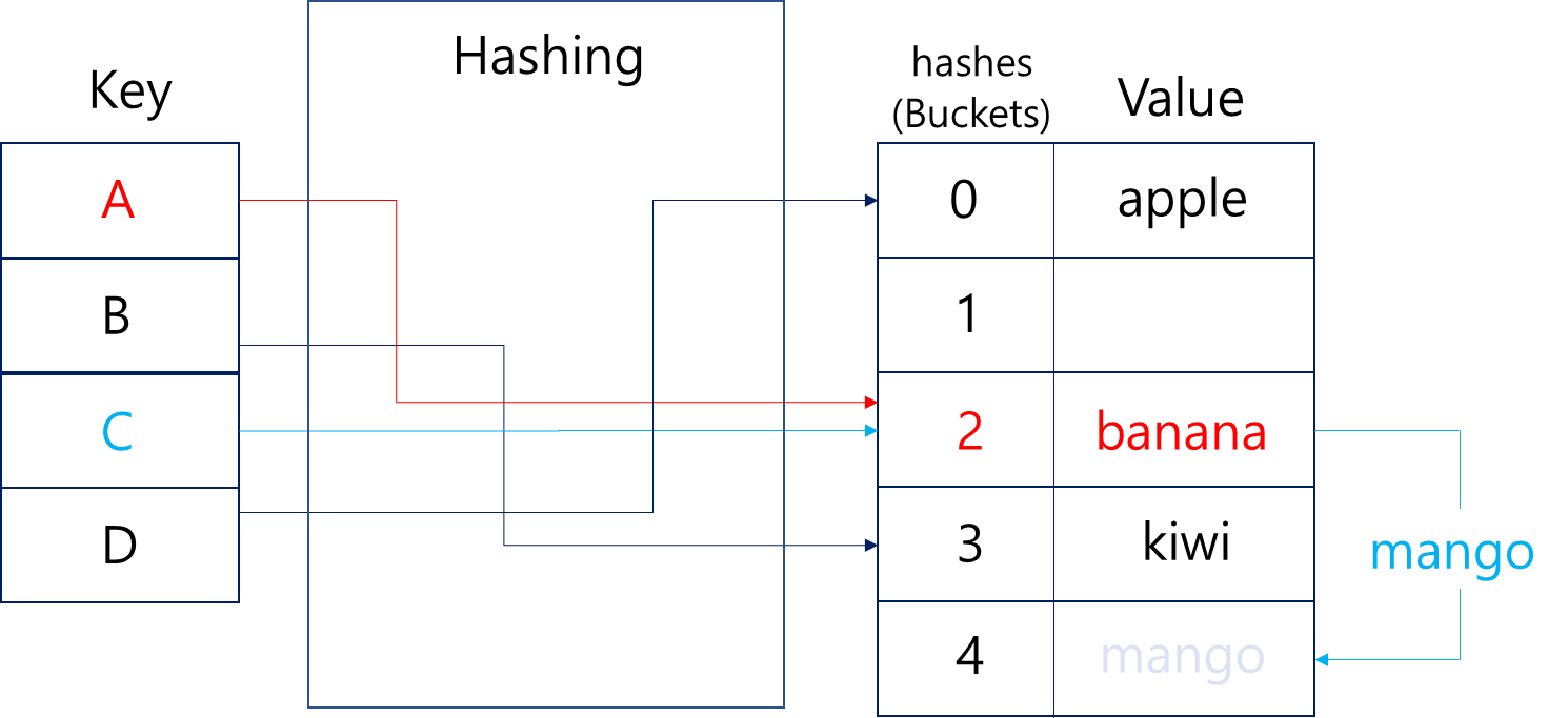 위 그림을 보시면 알 수 있듯, B와 D는 각각 해시함수의 결과값이 3과 0이 나와서 kiwi와 apple이라는 값을 잘 저장한 것을 볼 수 있습니다. 하지만 A와 C는 모두 2의 결과값을 가지게 되어 banana와 mango의 밸류가 충돌하게 되었네요.