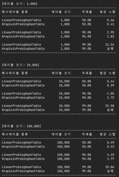 물론 제가 탐색 횟수를 임의로 제한하도록 구현했기 때문이지만, 적재율이 과도한 상태에서 krapvin 방식은 탐색 범위 파악에서 한계가 있음이 분명합니다.