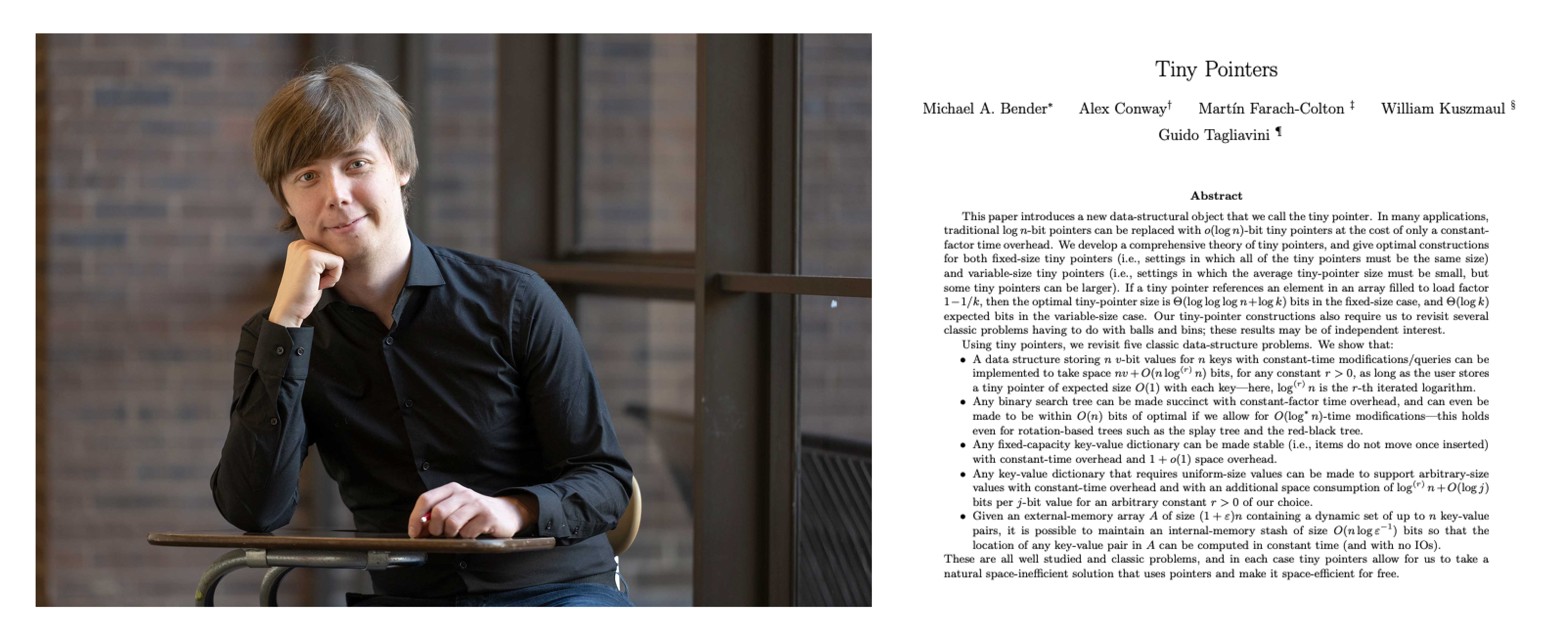 Andrew Krapivin는 2021년 Tiny Pointer라는 논문을 처음 접했습니다. 처음엔 관심 없었지만 2년 뒤, 그 논문을 다시 읽으며 포인터를 더 작게 만드는 아이디어를 떠올렸고, 이 과정에서 새로운 해시테이블을 발명하게 되었습니다.