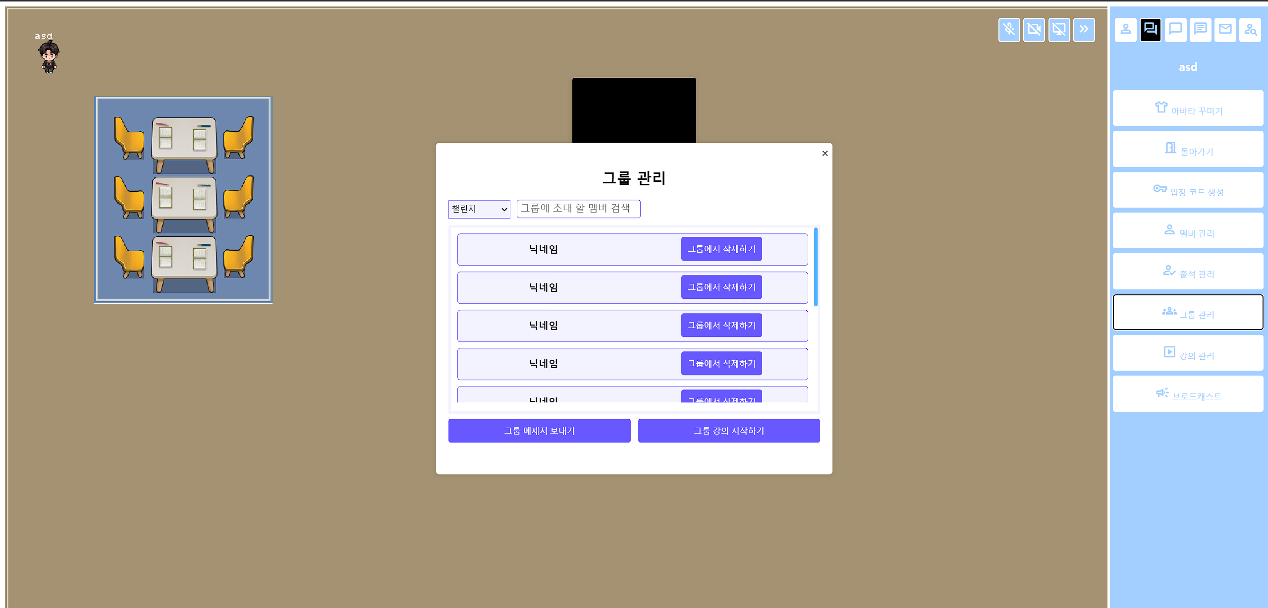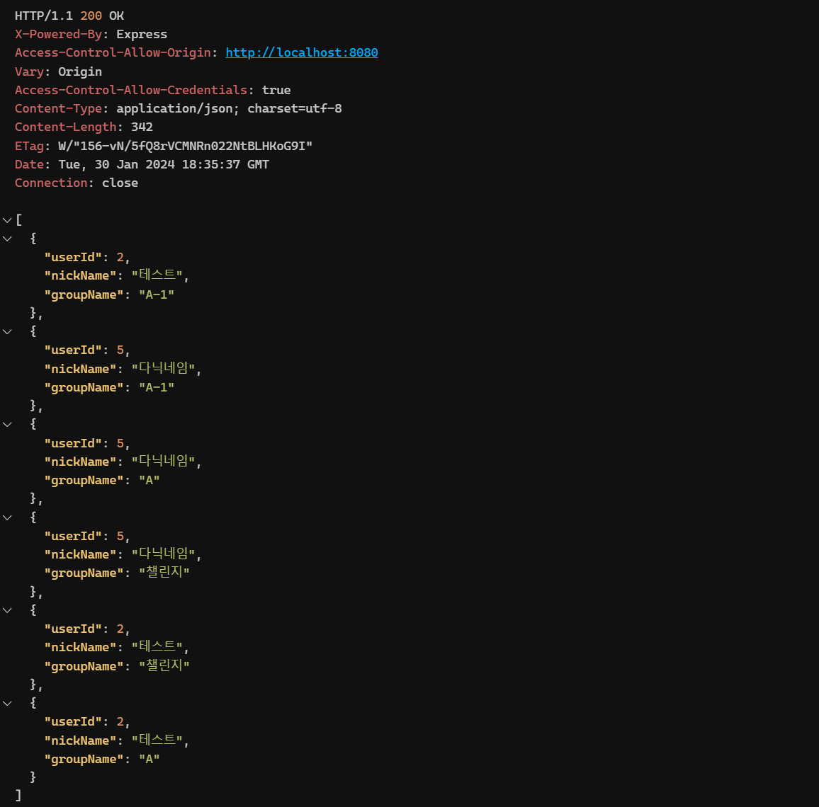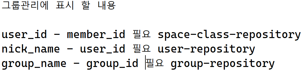 해당 스페이스의 관리자인 아이디로 스페이스에 속한 모든 사용자들의 그룹이름과 닉네임과 user_id값을 가지고와서 프론트에 뿌려줘야 한다.
