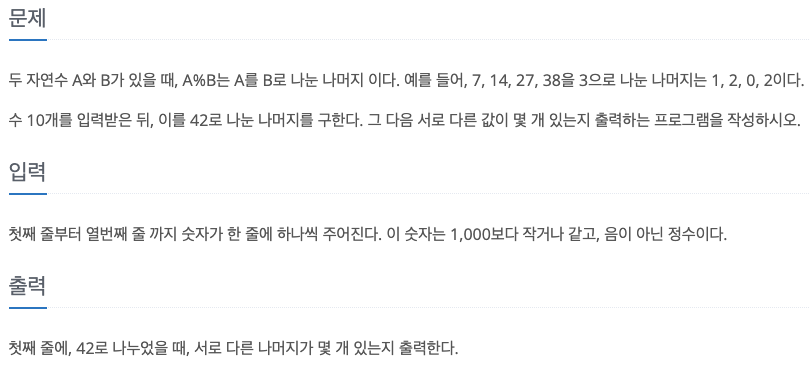 우선 배열을 만들고, 임의의 숫자 10개를 받습니다. 이를 42로 나눈 나머지를 다른 배열에 넣어준 뒤, for문에 넣어 숫자 하나씩 키워가며 이전 숫자와 비교합니다. 만약 숫자가 같다면 해당 배열은 -1로 체크를 해두고, 마지막에 돌며 -1을 확인 해줍니다.