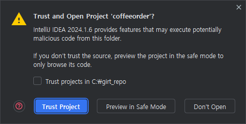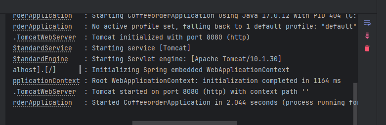 CoffeeorderApplication 클래스를 실행시키면 스프링 내장 Tomcat이 실행이 된다.