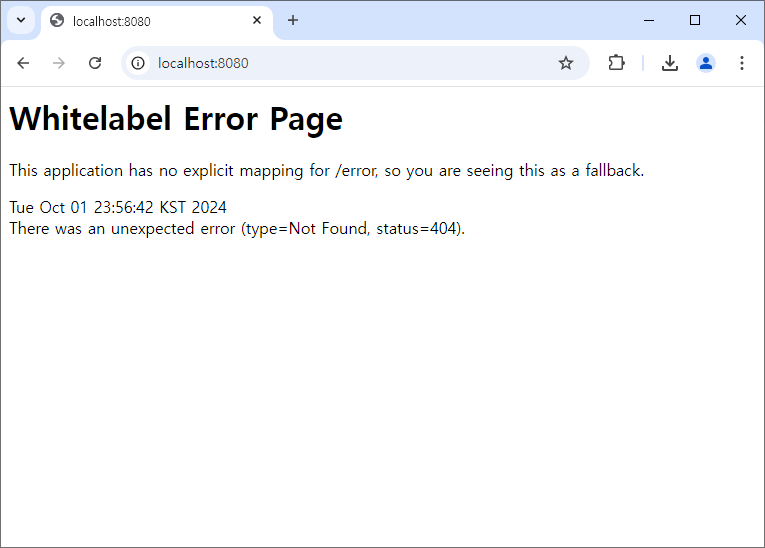 웹브라우저 주소에 localhost:8080을 입력하면 아래와 같이 출력되면 정상이다. Error Page가 나오는 것은 아직 개발을 하지 않아 보여줄 Web Page가 지정되지 않아 출력되는 것이다.