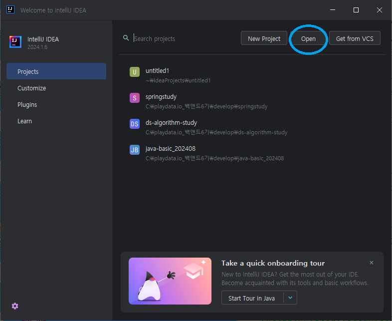 인텔리J -> Project -> Open