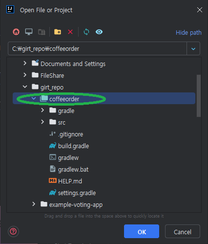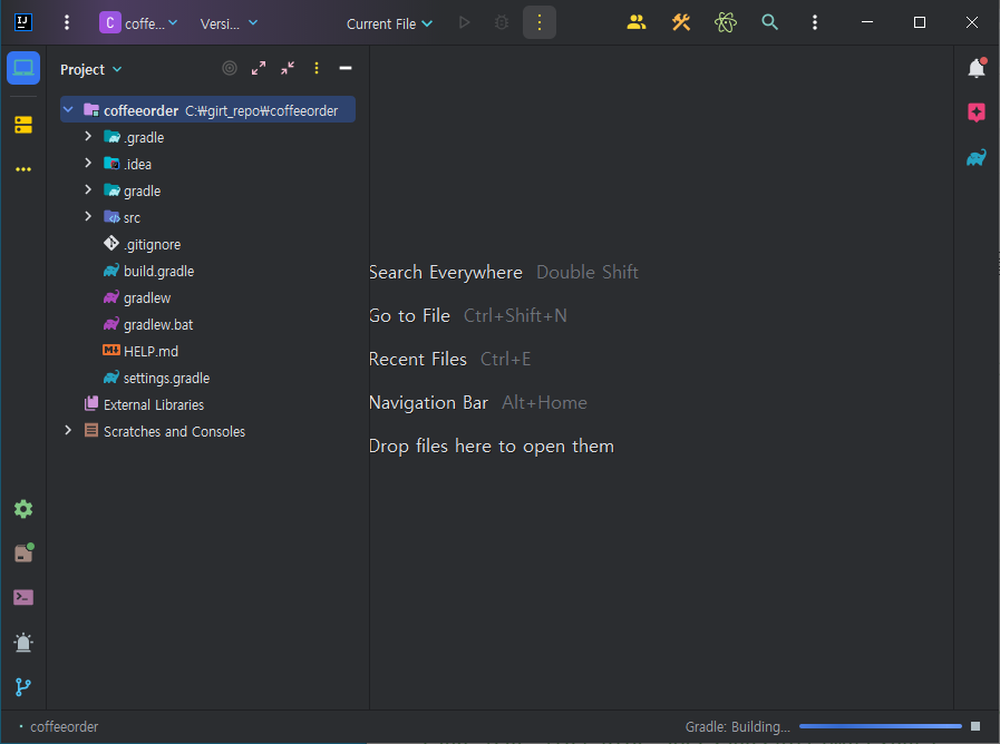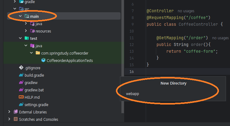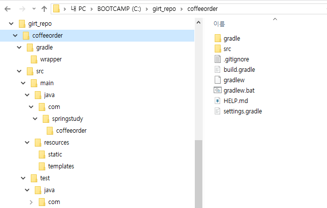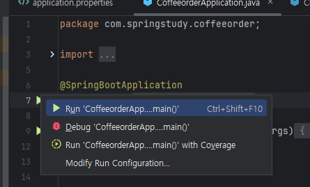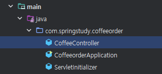 src/main/java/com.springstudy.coffeeorder/CoffeeorderApplication 클래스 파일에 Main Function이 있다.