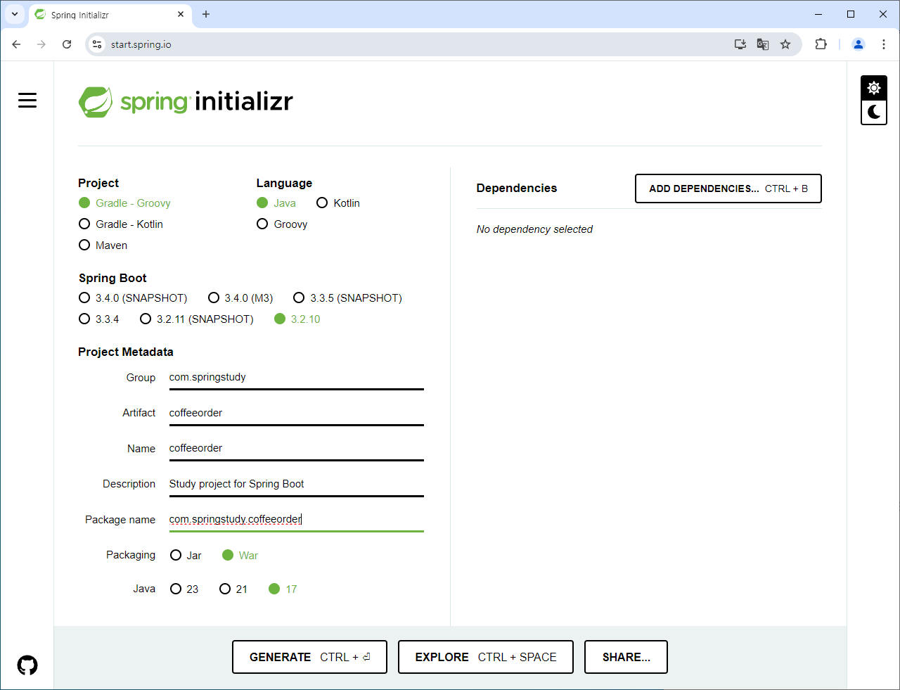 Spring 홈페이지 > Project > Spring Initializr