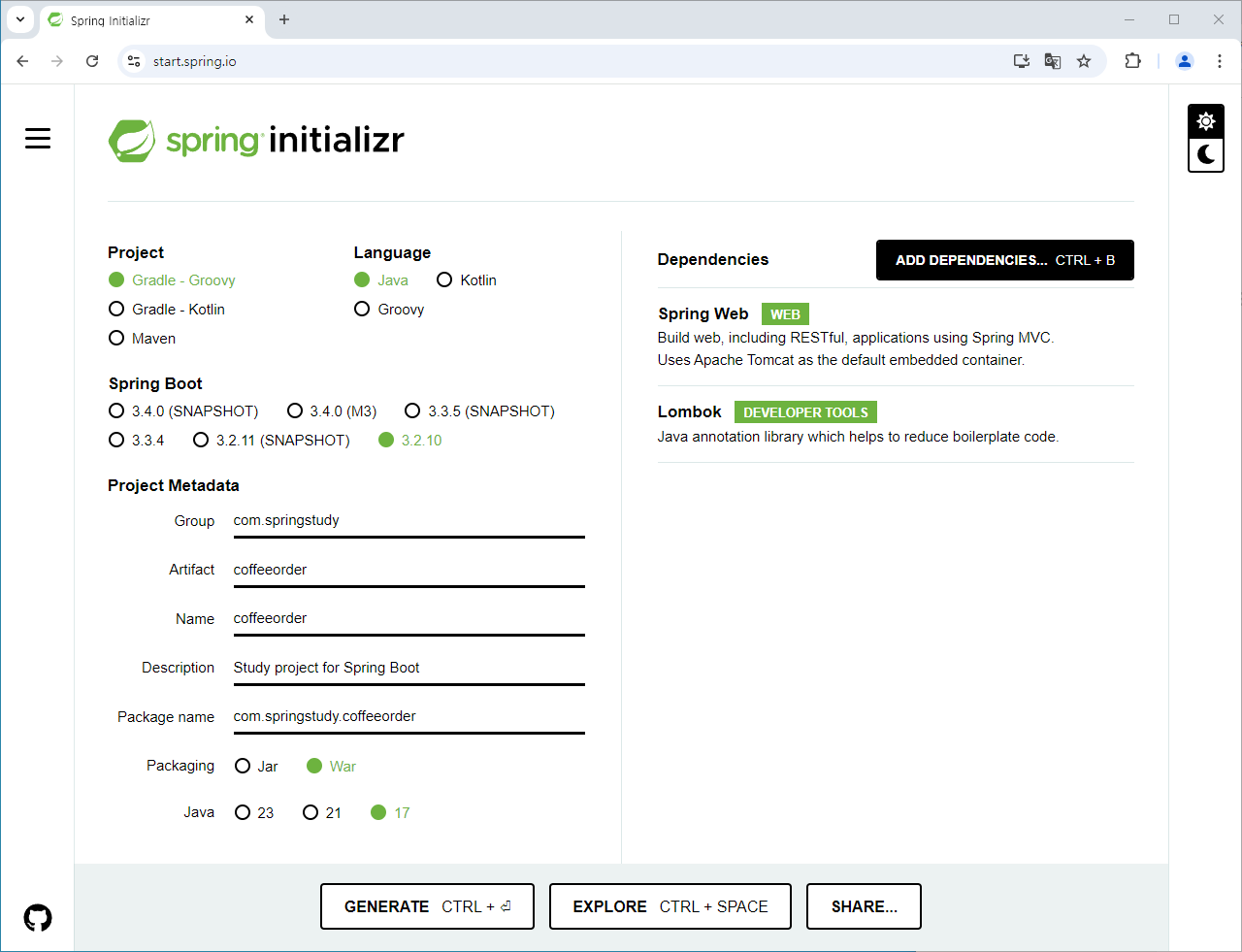 본 프로젝트에서 Spring Web과 Lombok을 추가하도록 한다.