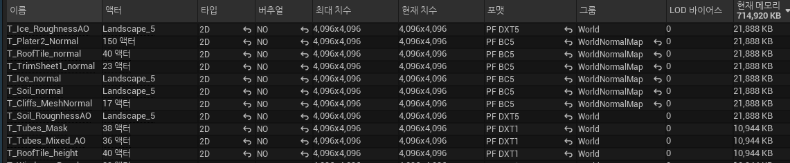 툴-> 검사 -> 통계를 누른 후 텍스쳐 통계를 누르면 사용중인 텍스쳐 정보가 전부 뜨고