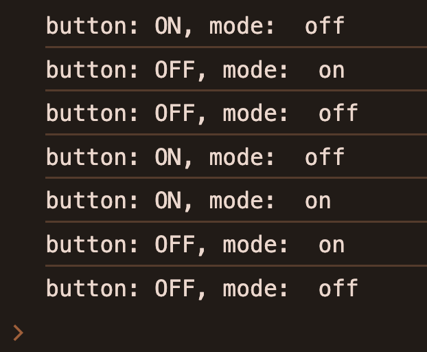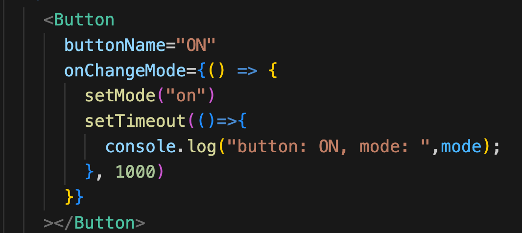예상대로라면, on버튼을 누르면 setMode("on")이 실행되어서 모드가 바뀌고 on이 출력되어야 하는데 실제론 그렇지 않았다.