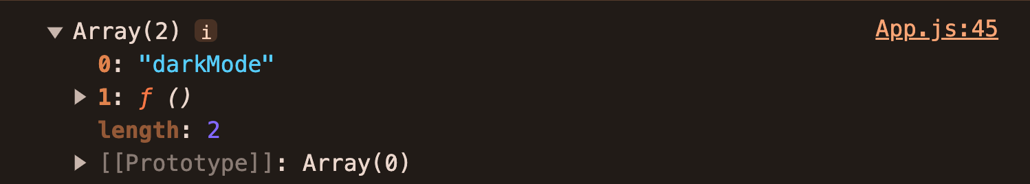 console.log()를 찍어보면 useState() 함수의 반환값으로 배열이 반환된 것을 볼 수 있다. 배열의 첫 번째 원소는 우리가 설정한 'darkmode'라는 문자열이고, 두 번째 원소는 함수가 들어있다.