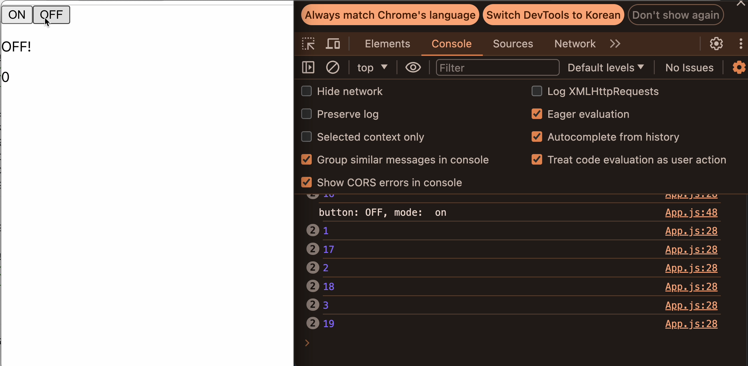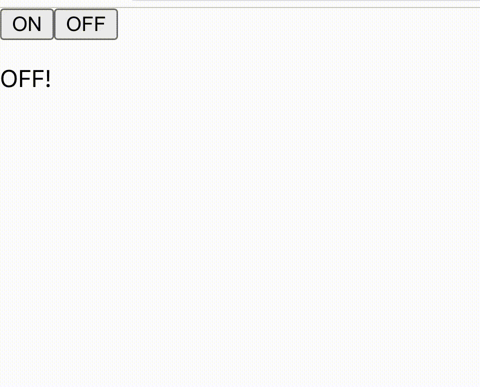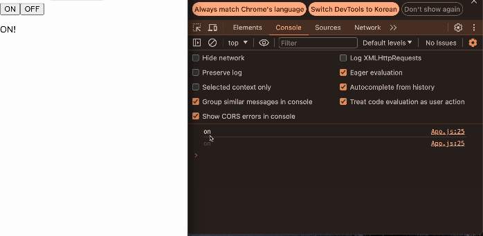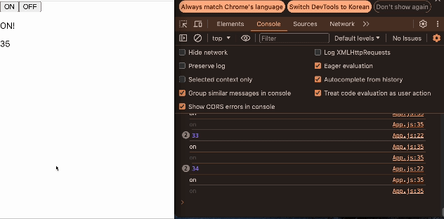 버튼을 눌렀을 때, setMode()는 즉시 실행되어서 App() 함수가 즉시 재실행되고 화면도 즉시 다시 렌더링되어 OFF!라는 문구가 뜨는 걸 볼 수 있다.
