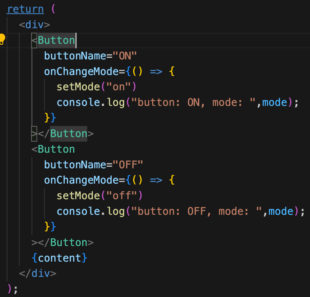 import {useState} from 'react'; // const Button = (props) => ( <button onClick={(e) => { e.preventDefault(); props.onChangeMode(); }} {props.buttonName} </button> ); const Header = (props) => <header>{props.currentMode}</header>; // function App() { const [mode, setMode] = useState("on"); let content = null; if (mode === "on") { content = <p>ON!</p> } else if(mode === "off") { content = <p>OFF!</p> } // return ( <div> <Button buttonName="ON" onChangeMode={() => { setMode("on") }} </Button> <Button buttonName="OFF" onChangeMode={() => { setMode("off") }} </Button> {content} </div> ); }