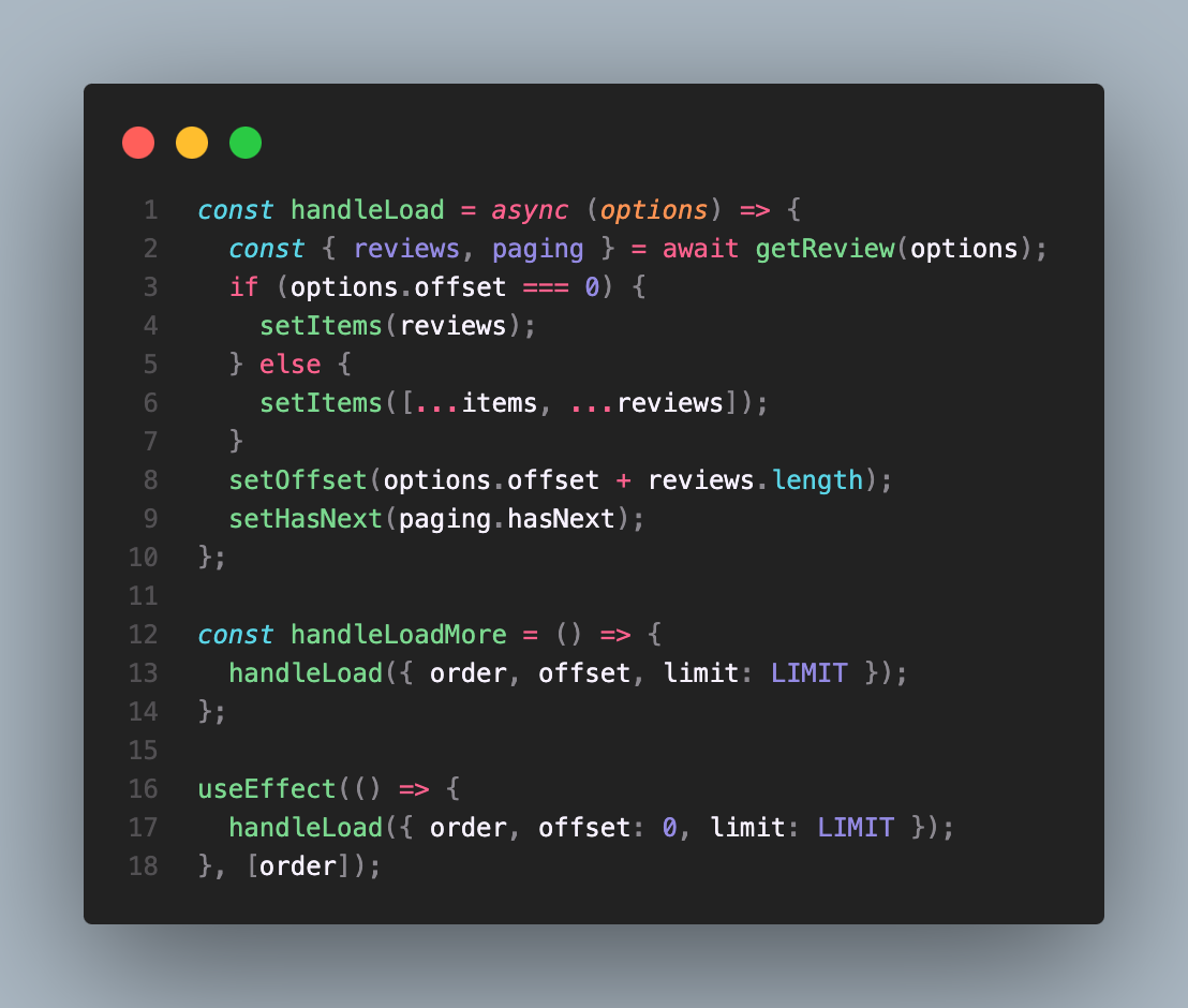 여기서 offset은 처음에 한 번 값이 0으로 할당되면 추가로 실행될 필요가 없고, order의 경우에는 정렬 기준을 바꾸는 값이므로 바뀔 때마다 데이터를 다시 받아와야 하기 때문에 Dependency Array안에 추가해준다.