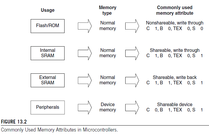 If you are using a microcontroller with cache memory, then you should program the MPU according to the cache policy you want to use(e.f., cache disable/write through cache/write back cache). When TEX[2] is 1. the cache and inner cache is as hown in table 13.9