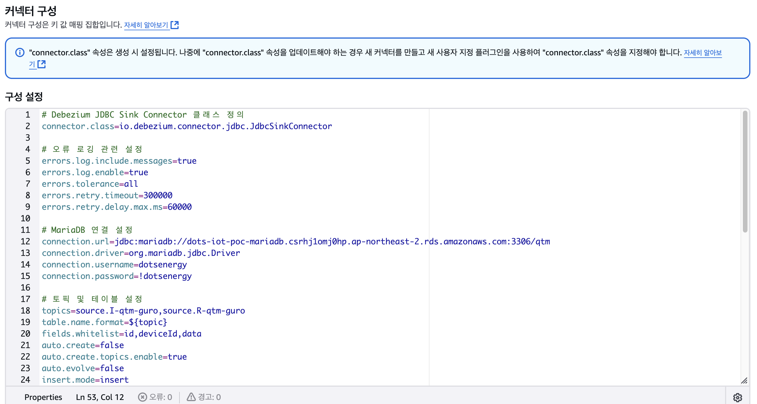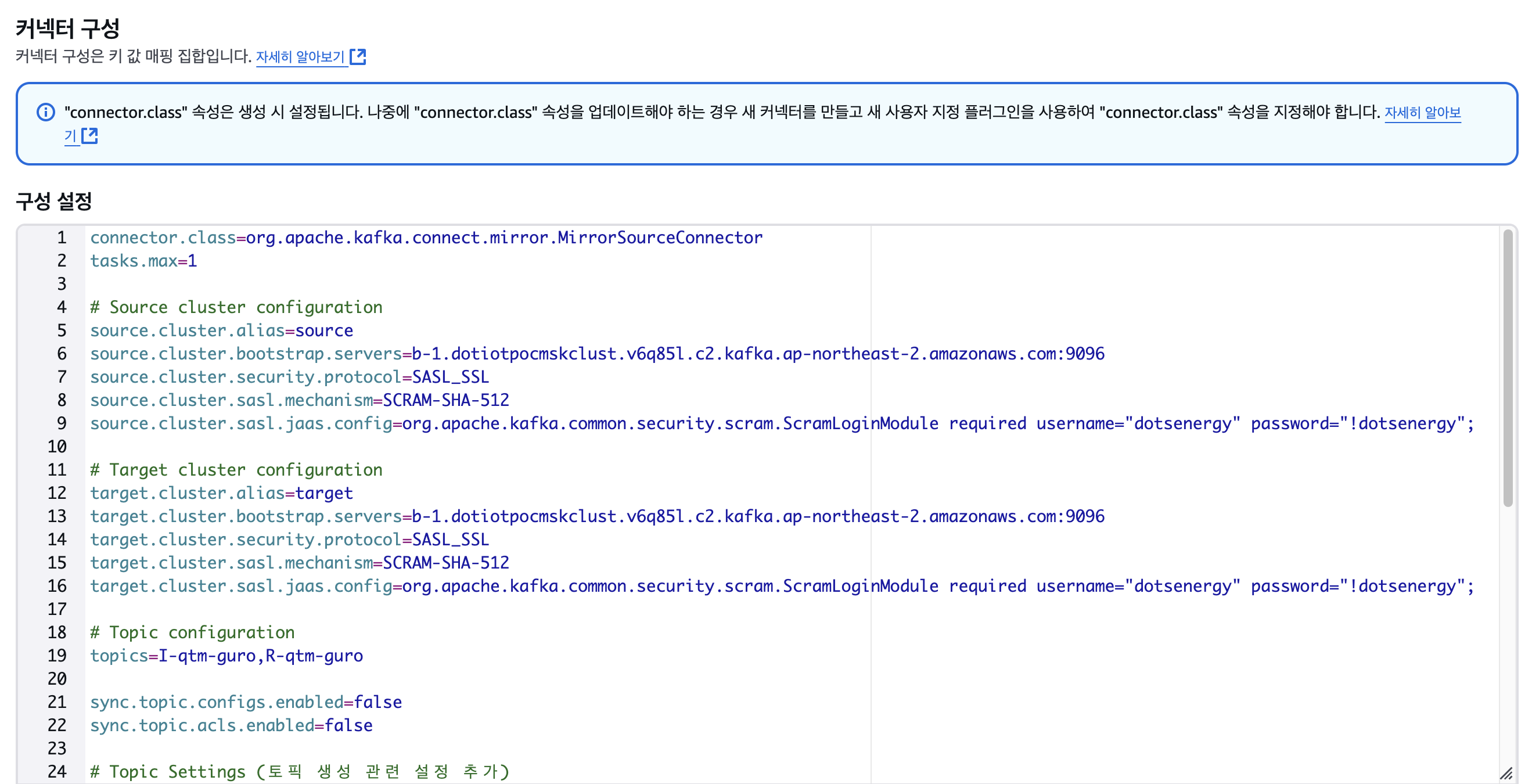 즉, dots-iot-poc-mirror-topic-connector 를 설정할때, 기본 설정은 유지한 채 topics=I-qtm-guro,R-qtm-guro