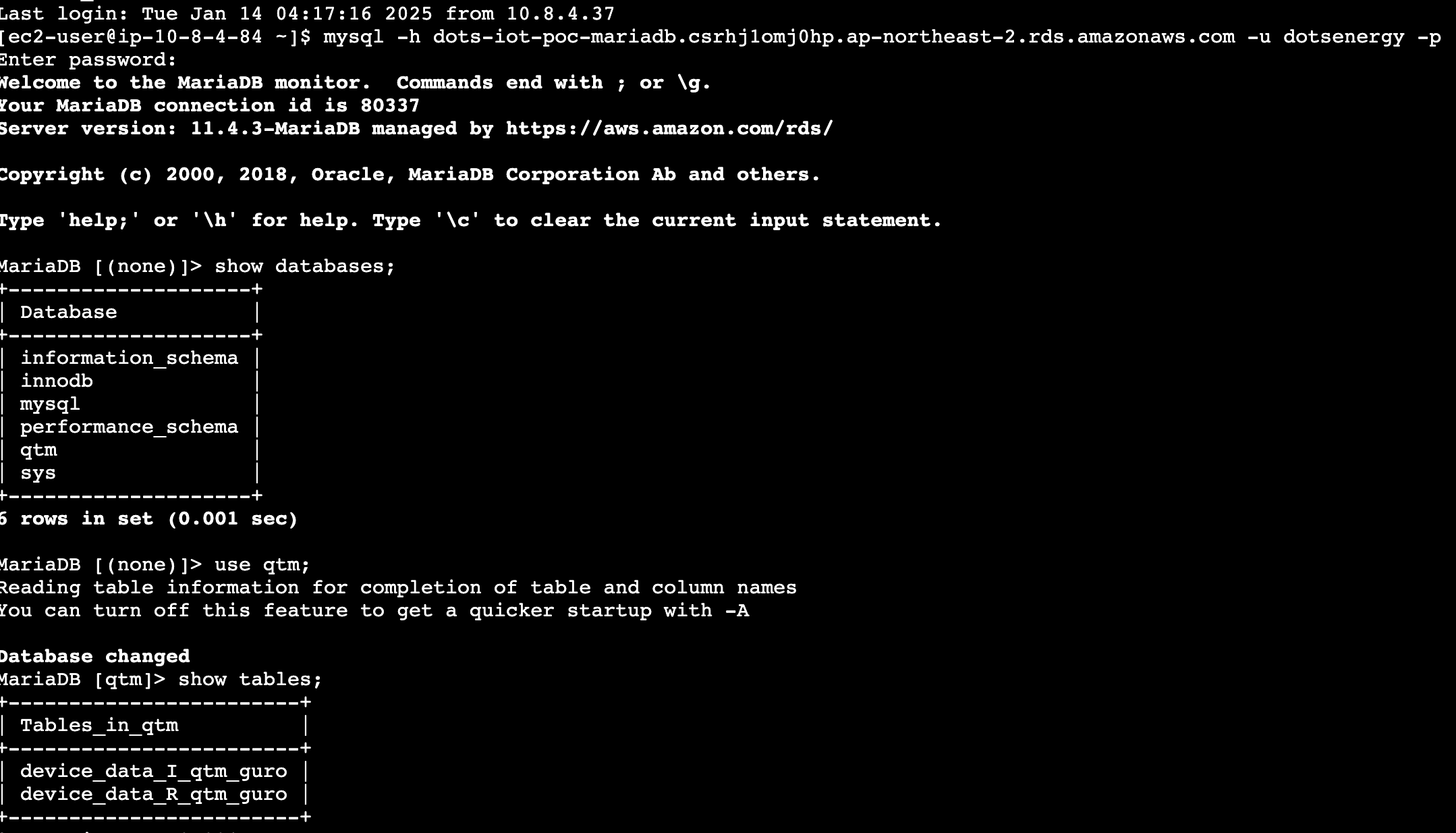 print(f"Connecting to database: {db_name} at {rds_host}")