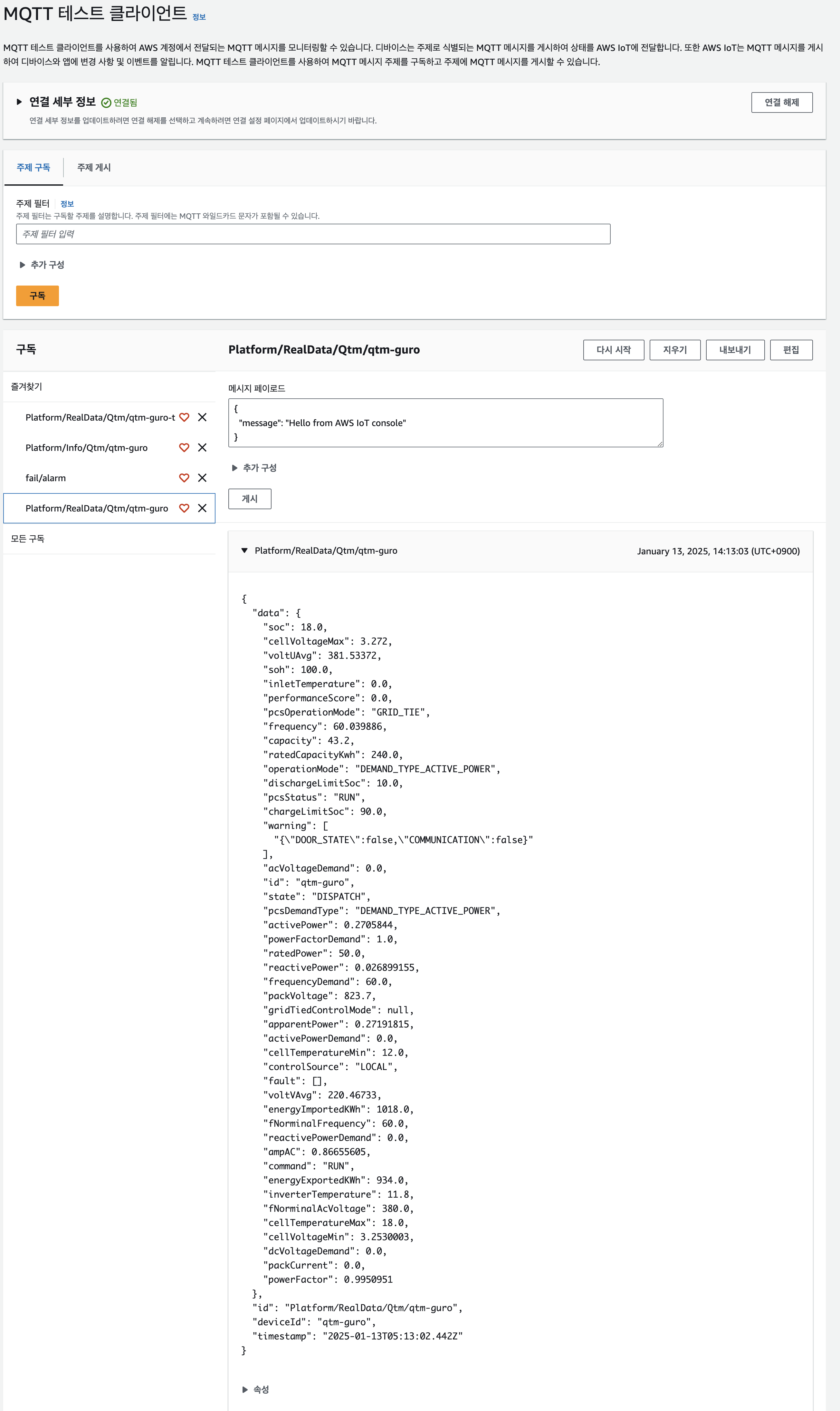 AWS IoT -> 테스트 -> MQTT 테스트 클라이언트 -> 주제 구독 -> 주제 필터 -> Platform/RealData/Qtm/qtm-guro 입력 -> 구독