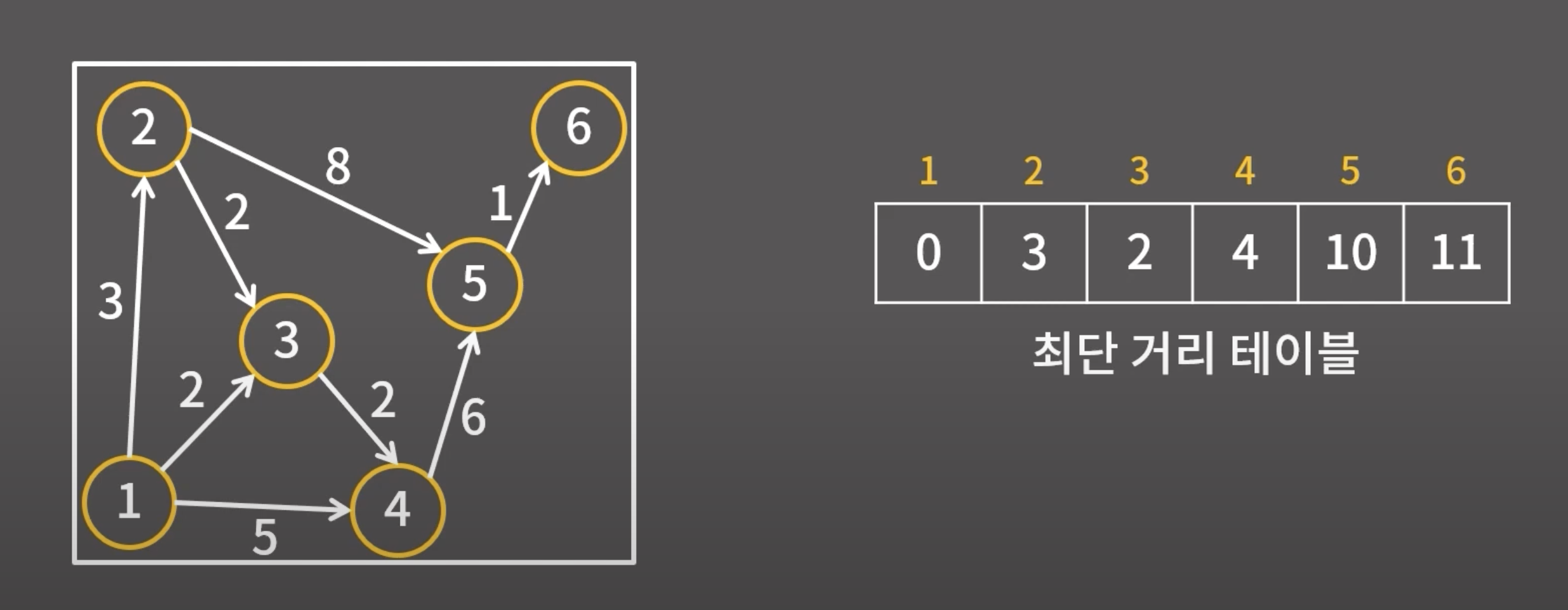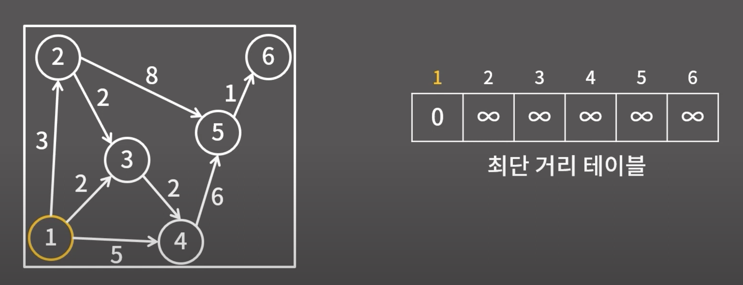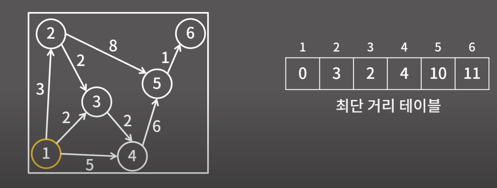 - 하나의 시작점으로부터 다른 모든 정점까지의 최단 거리를 구하는 알고리즘