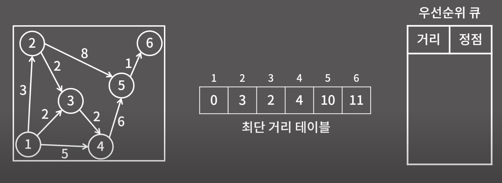4. 우선순위 큐가 빌 때 까지 2, 3번 과정을 반복.