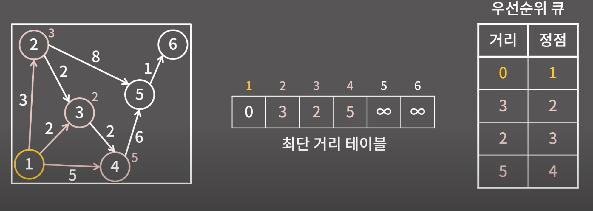 2. 우선순위 큐에서 거리가 가장 작은 원소를 선택, 해당 거리가 최단 거리 테이블에 있는 값과 다를 경우 넘어감.