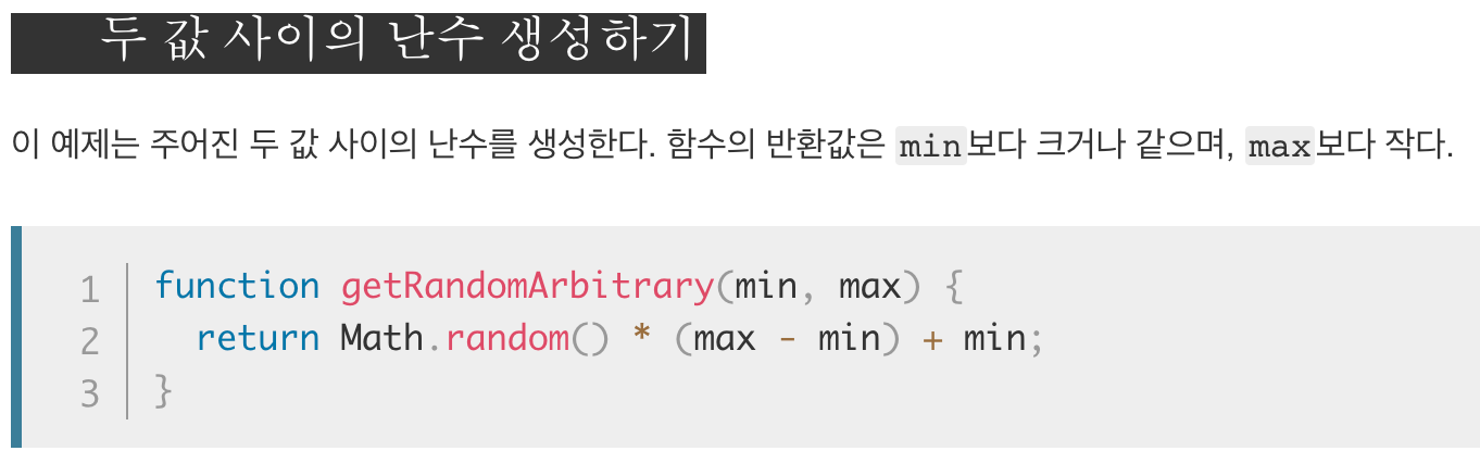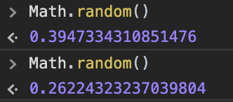 Math.random() 함수는 0 이상 1 미만의 구간에서 근사적으로 균일한(approximately uniform) 부동소숫점 의사난수를 반환하며, 이 값은 사용자가 원하는 범위로 변형할 수 있다. 난수 생성 알고리즘에 사용되는 초기값은 구현체가 선택하며, 사용자가 선택하거나 초기화할 수 없다.