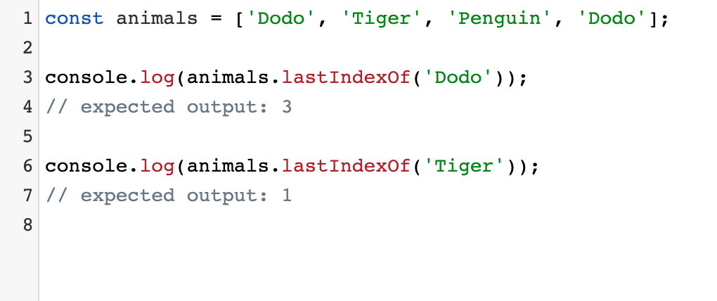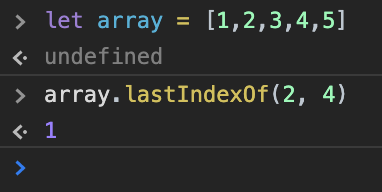 lastIndexOf() 메서드는 배열에서 주어진 값을 발견할 수 있는 마지막 인덱스를 반환하고, 요소가 존재하지 않으면 -1을 반환합니다. 배열 탐색은 fromIndex에서 시작하여 뒤로 진행합니다.