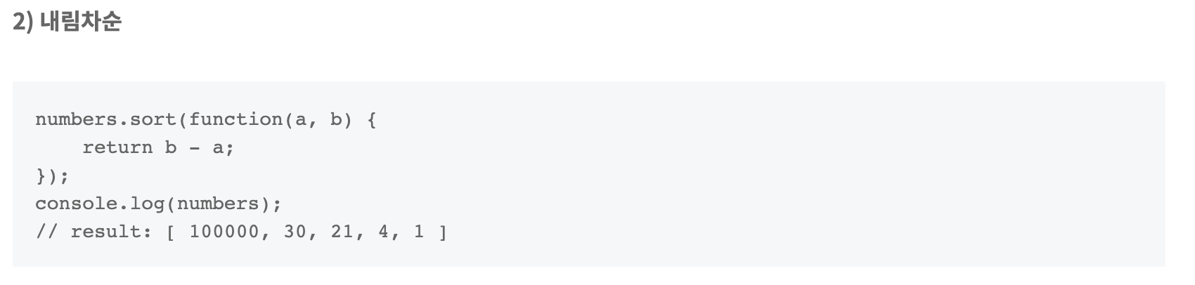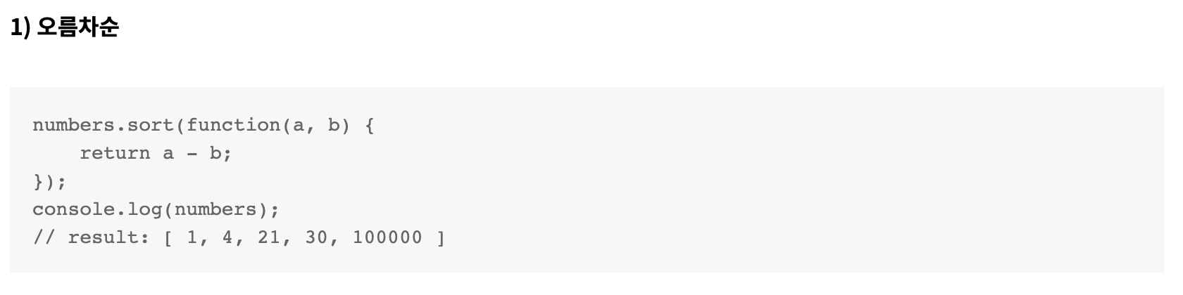 sort() 메서드는 배열의 요소를 적절한 위치에 정렬한 후 그 배열을 반환합니다. 정렬은 stable sort가 아닐 수 있습니다. 기본 정렬 순서는 문자열의 유니코드 코드 포인트를 따릅니다.