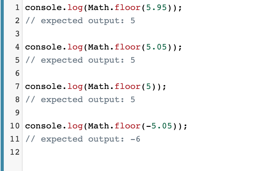 Math.floor() 함수는 주어진 숫자와 같거나 작은 정수 중에서 가장 큰 수를 반환합니다.