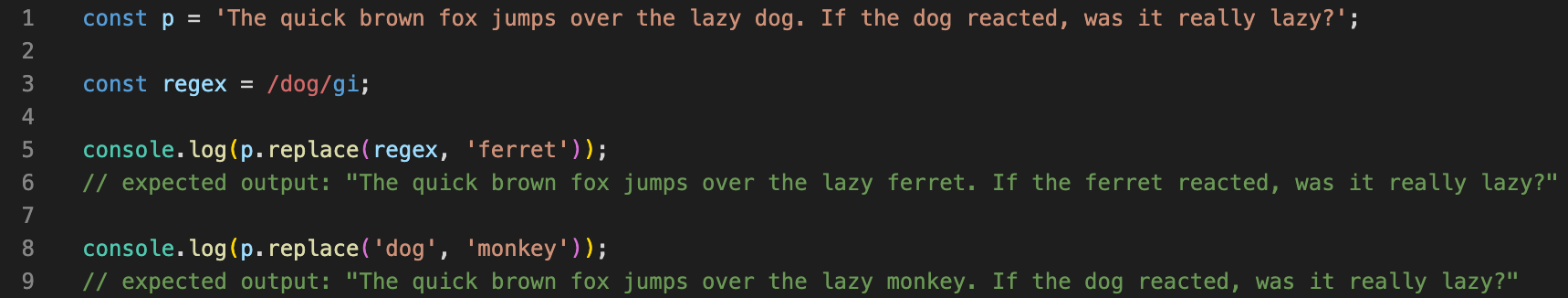 replace() 메서드는 어떤 패턴에 일치하는 일부 또는 모든 부분이 교체된 새로운 문자열을 반환합니다. 그 패턴은 문자열이나 정규식(RegExp)이 될 수 있으며, 교체 문자열은 문자열이나 모든 매치에 대해서 호출된 함수일 수 있습니다.