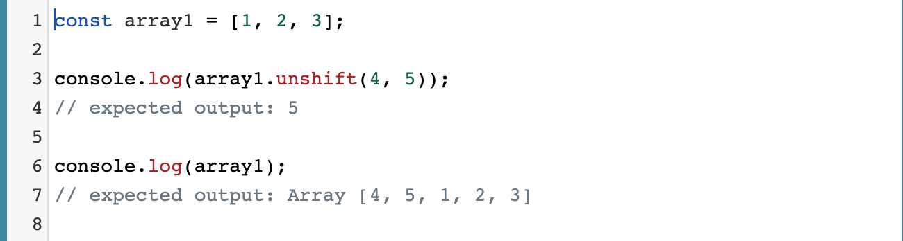 unshift() 메서드는 새로운 요소를 배열의 맨 앞쪽에 추가하고, 새로운 길이를 반환합니다.