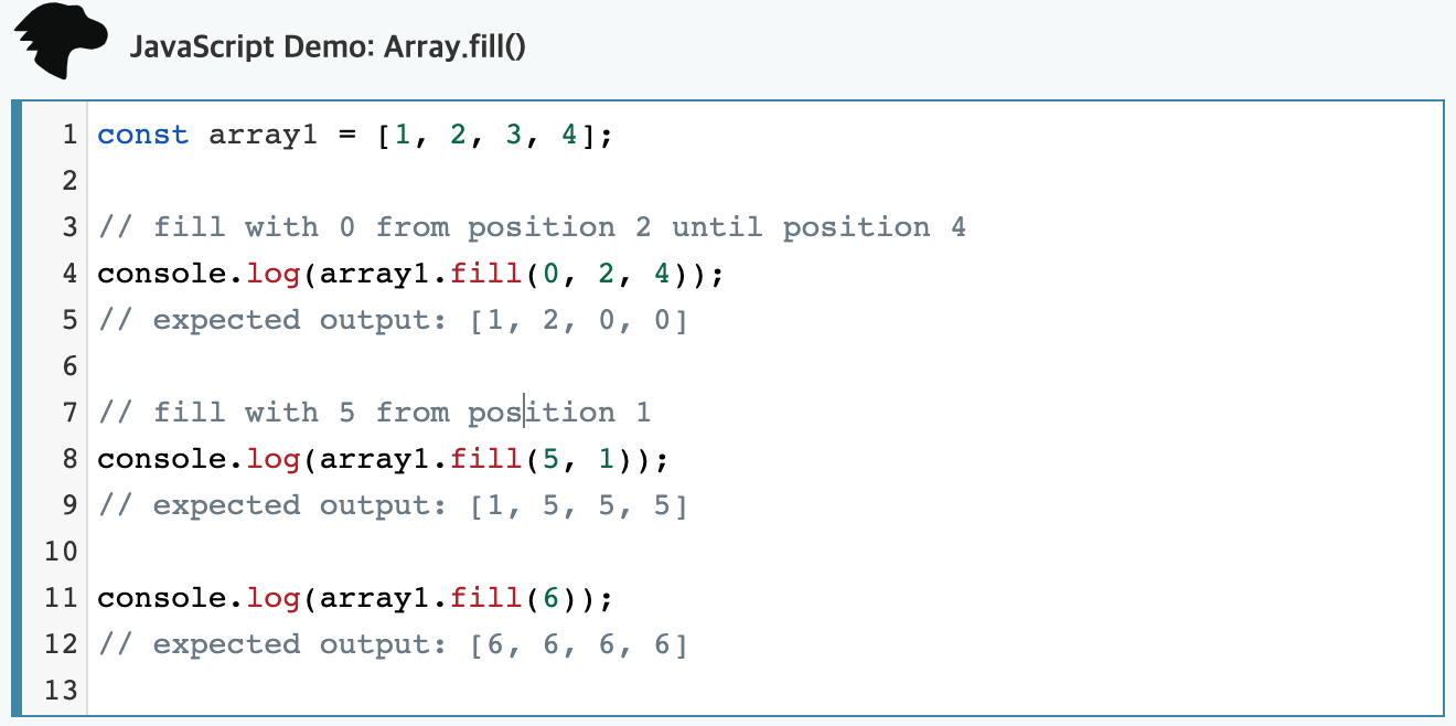 fill() 메서드는 배열의 시작 인덱스부터 끝 인덱스의 이전까지 정적인 값 하나로 채웁니다.