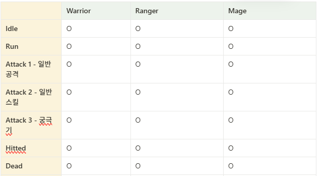 각 클래스별로 당장에 필요한 애니메이션 목록은 다음과 같다.