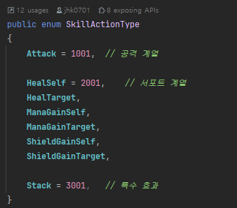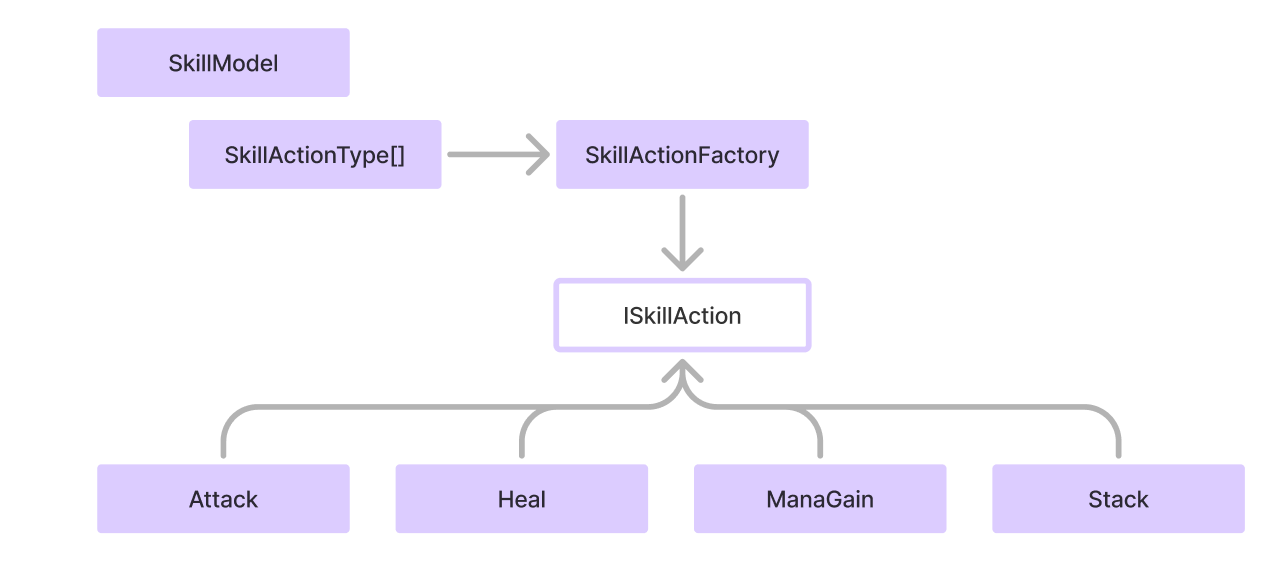 각각의 스킬 액션은 enum 값으로 가지고 있다가 SkillActionFactory를 통해서 받아온다.