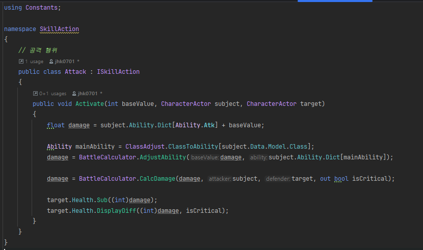 반환한 스킬 액션은 모두 아래처럼 ISkillAction 인터페이스를 구현하고 있다.