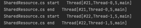 실행 결과를 확인해 보면 한 스레드(#21)의 작업이 끝날때까지 다른 스레드(#22)의 접근이 차단되는것을 알 수 있다.