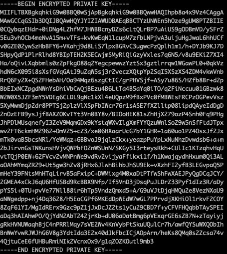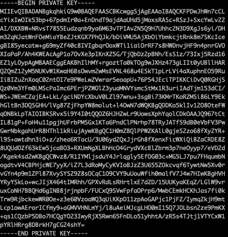 이렇게 만든 키를 인코딩까지 하게되면 우리가 항상 보던 private 키가 완성이 된다. 인코딩은 PEM방식을 주로 사용하며 이렇게 완성된 키는 다음과 같은 모습을 띄게된다.