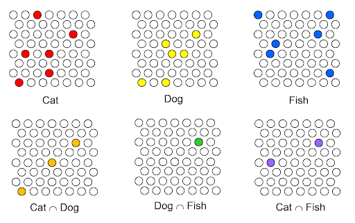 위 이미지에서 보듯 고양이, 강아지, 생선끼리의 교집합을 통해 얼마나 가까운지에 대해서는 확인할 수 있으나 어떤 점이 색칠되어있는지 안다고 해서 해당 데이터를 전부 이해할수는 없다.