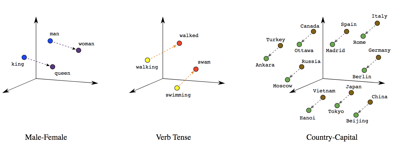 위 이미지를 보면 서로 비슷한 의미를 가진 단어끼리 가깝게 위치하며 각 단어간의 의미론적 차이가 벡터를 통해서도 표현이 되어있는 모습을 볼 수 있다.